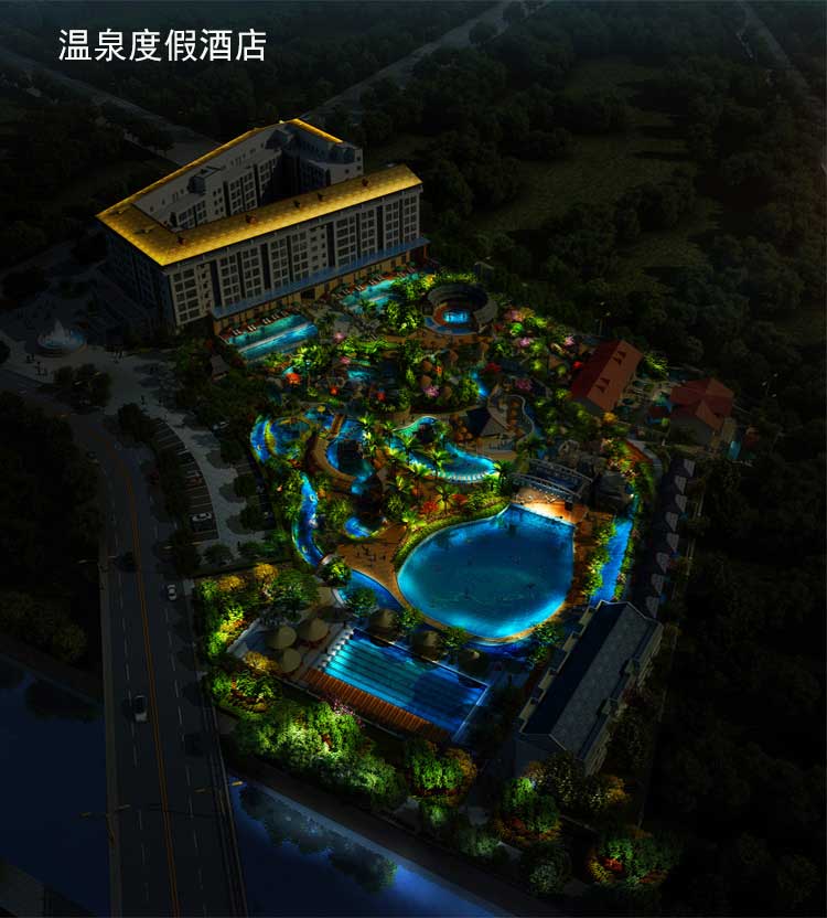 溫泉度假酒店是集休閑、娛樂、度假為一體的綜合休閑場所,內設主要是以酒店和溫泉池倆部分構成。亮化的主要核心就是酒店樓體的亮化和酒店溫泉周圍的亮化,我公司設計主要是采用了主體黃暖光,配合藍色水光燈的效果,將樓體和溫泉池勾勒出來。
