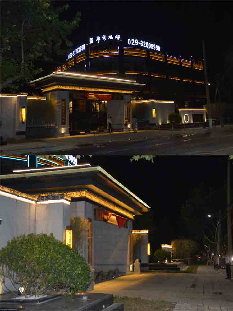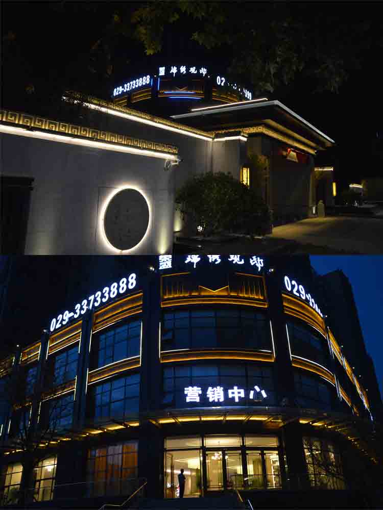 簡介—— 2018 榮盛景秀觀邸售樓部亮化,蘭光設計師根據其榮盛景秀觀邸售樓部商業屬性,商業照明設計明亮而醒目,營造商業經營的夜景氛圍。以靜態的暖色燈光將其打亮,凸顯雅致。“榮盛景秀觀邸”標志以高亮度的燈光,吸引顧客注意,增強商業宣傳力度。景觀燈造型與建筑外立面造型完美融合,晚上光斑效果與綠植景觀交相輝映,相映成趣!榮盛景秀觀邸